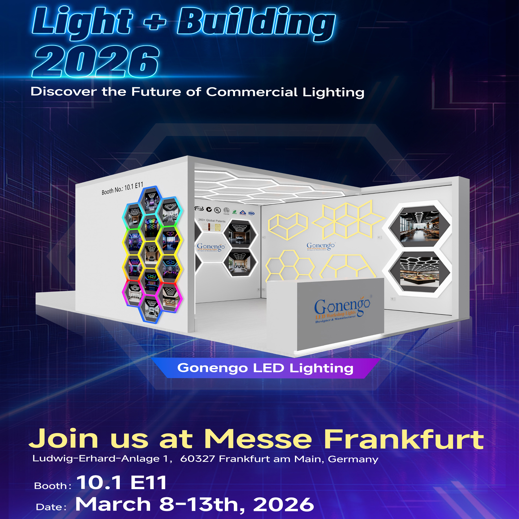 This March, we are excited to announce that we will be showcasing our latest geometric LED lights at Messe Frankfurt in Germany. From March 8–13, 2026, you can find us at Ludwig Erhard Anlage 1, 60327 Frankfurt am Main, Germany, Booth 10.1 E11.
